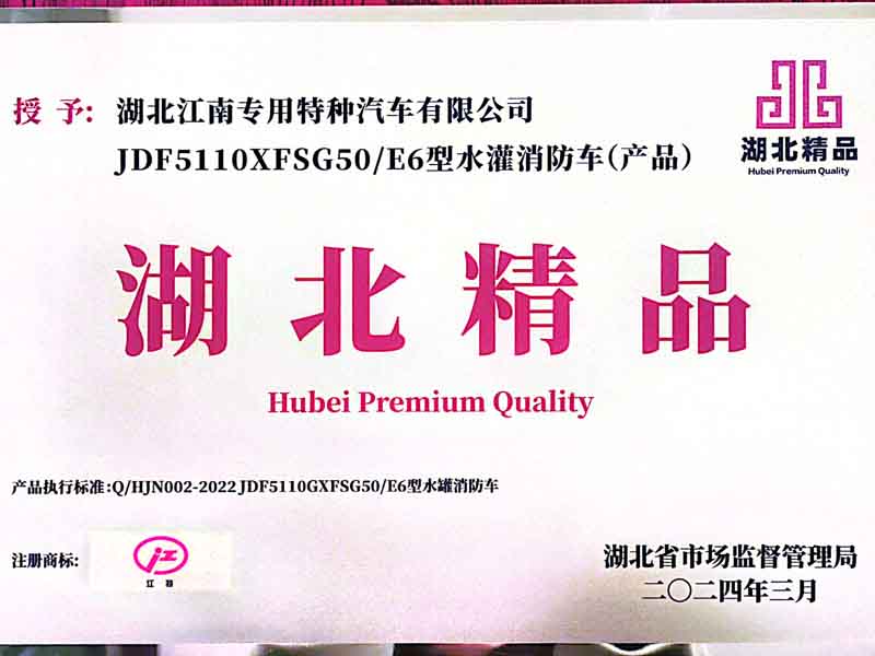 江南JDF5110GXFSG50/E6型水罐消防車獲得“湖北精品”榮譽稱號